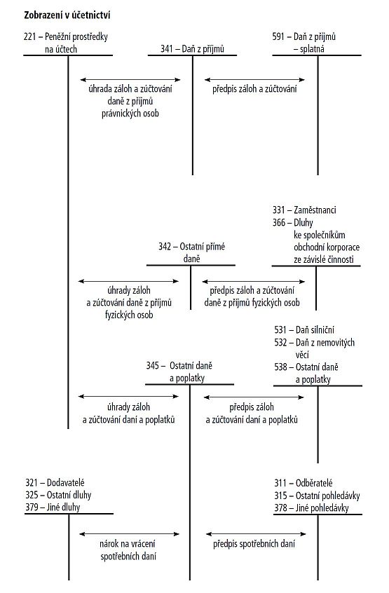 Ve prospěch účtu se účtuje podle daňových dokladů daňová povinnost ze spotřebních daní a z dalších daní podle daňových předpisů – např. o silniční dani, dani z nemovitých věcí a dani z nabytí nemovitých věcí. Na vrub účtu se účtuje odvod daně nebo odvod záloh na daň, případně nárok na vrácení daně.