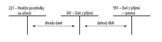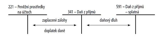 Ke konci rozvahového dne se zde vyúčtuje dluh účetní jednotky ze splatné daně k finančnímu orgánu za zdaňovací období podle přiznání k dani, a to se souvztažným zápisem na vrub účtu 591 – Daň z příjmů – splatná.