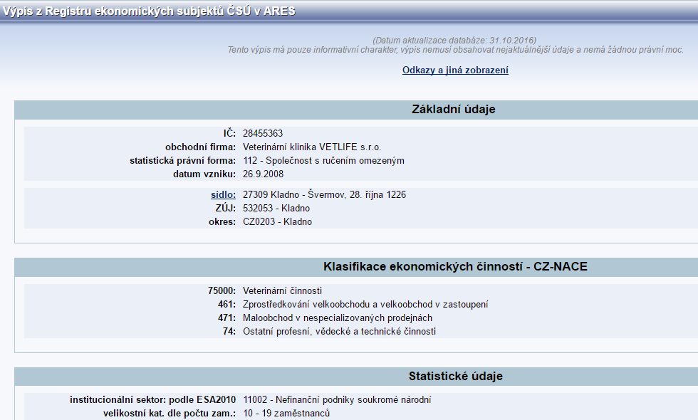 Obrázek č. 1: Údaje o provozovně s více činnostmi v systému ARES
