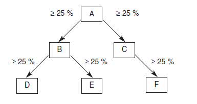 O řád složitější situace nastává u nepřímého kapitálového spojení. O něj půjde u obchodních korporací (D, E a F) vůči subjektu A, který se na nich podílí nepřímo, a to prostřednictvím držby kvalifikovaného podílu ve firmách B a C. Podmínkou je, aby ve vertikálním směru mezi jednotlivými úrovněmi byla minimálně 25% účast na základním kapitálu (hlasovacích právech). Spojenými osobami jsou všechny subjekty A, B, C, D, E a F.