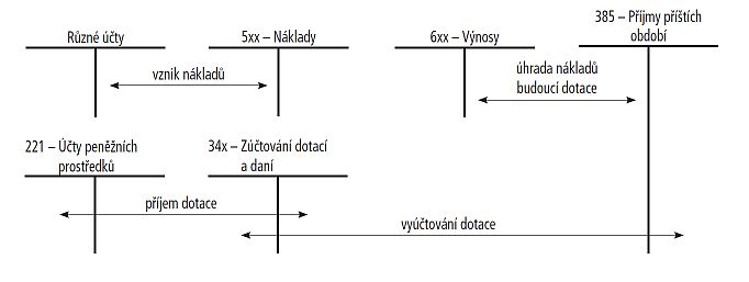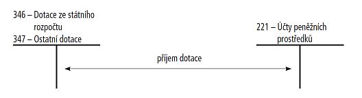 O nároku na dotaci účetní jednotka neúčtuje, je účtován až příjem dotace na základě výpisu z účtu peněžních prostředků. Souvztažný zápis záleží na tom, z kterého zdroje byla dotace poskytnuta.